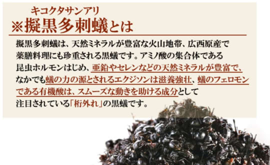 とはいえ、ミネラルや昆虫ホルモンが豊富な黒アリは本場中国で長い歴史を持つれっきとした漢方薬。