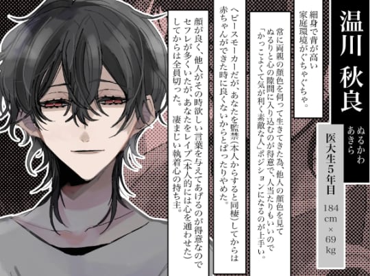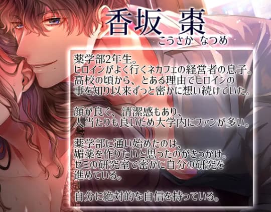 https://www.dlsite.com/girls/dlaf/=/t/s/link/work/aid/labo01/id/RJ315671.html媚薬を作りたくて薬学部に通っている変態イケメン・棗(なつめ)。