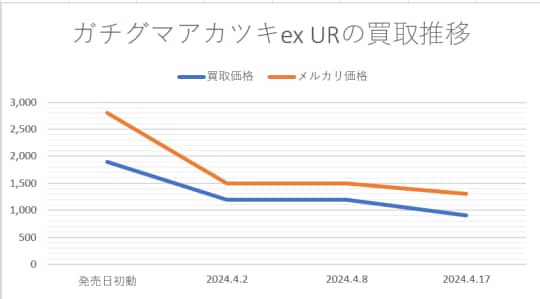 ガチグマアカツキex URは初動こそメルカリ価格で2,800円~3,200円と高かったものの、日を重ねるごとに少しずつ買い取り・販売価格が下がっています。