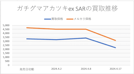 発売日初動は3,300円の買い取り価格だったガチグマアカツキex SARですが、順当に価格が下がってきた矢先に再度価格が高騰しています。